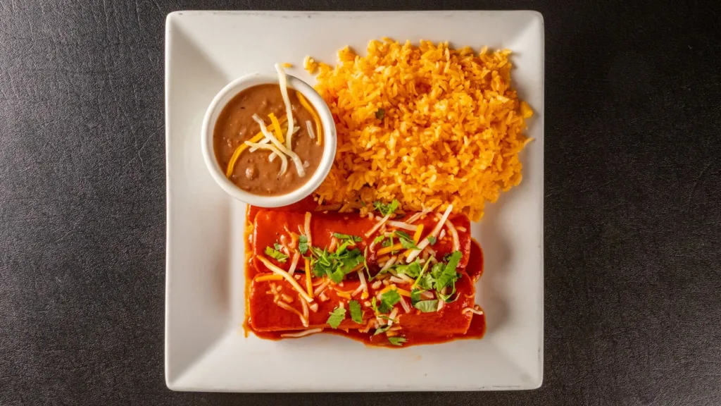 Served with 1 taco, 1 enchilada, rice and beans.